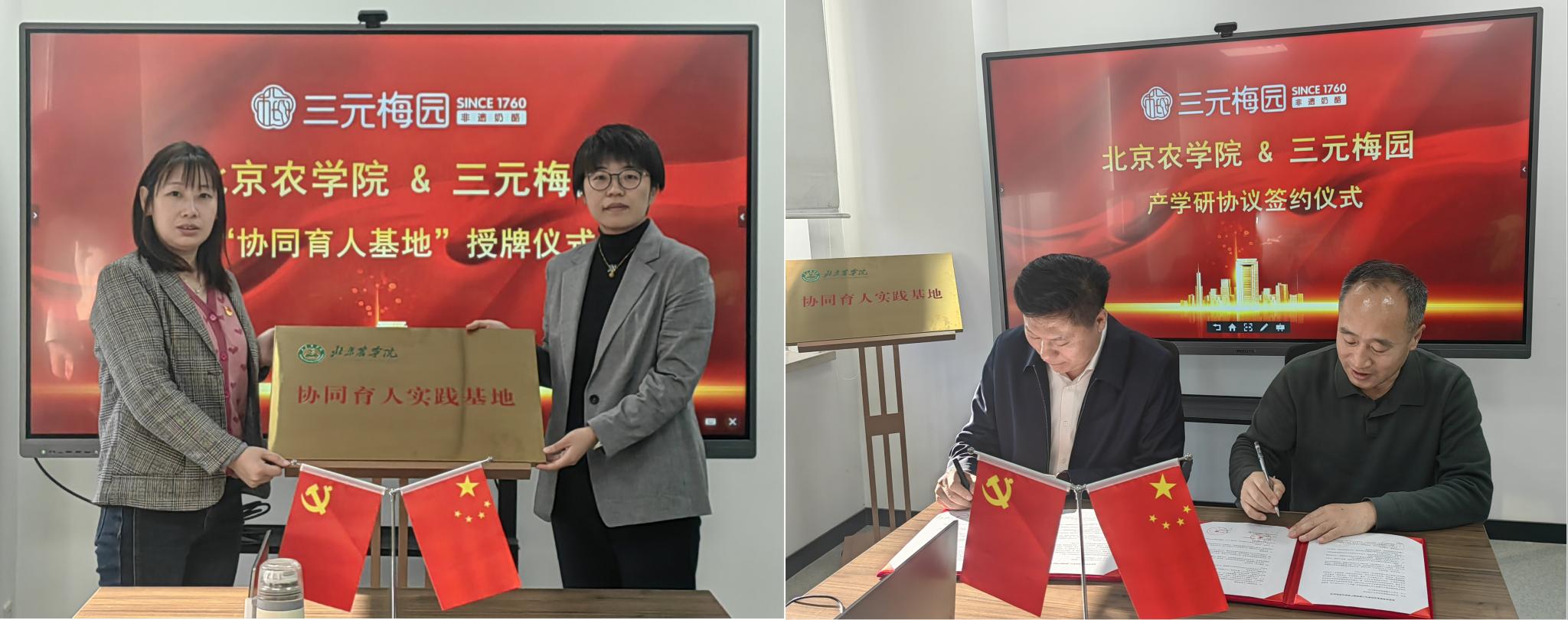 为创新人才培养机制,服务首都食品产业发展,2025年12月31日,太阳成集团与北京三元梅园食品有限公司“协同育人实践基地”签约暨授牌仪式成功举行。学院党委书记靳晓熙、院长张红星等全体班子成员,与三元梅园总经理付海涛等企业代表共同参加。